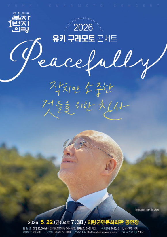 | 의령군은 자체 기획공연 ‘유키 구라모토 콘서트 ’가 오는 5월 22일 오후 7시 30분 의령군민문화회관 공연장에서 열린다고 밝혔다.