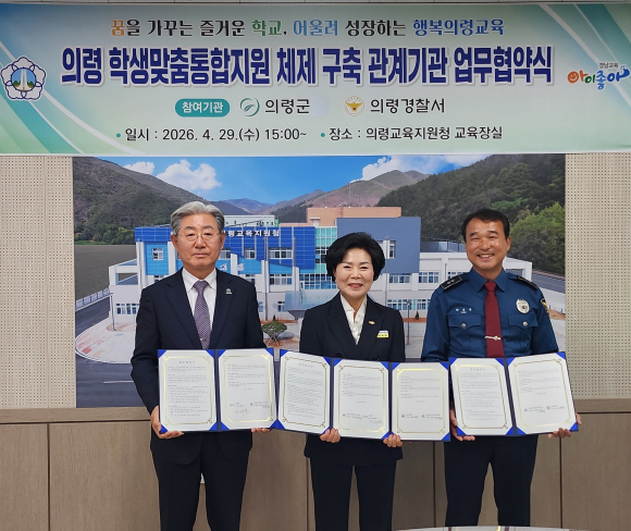 의령교육지원청(교육장 서회영)은 4월 29일(수), 의령교육지원청 교육장실에서 의령군(군수 오태완) 및 의령경찰서(서장 정욱용)와 학생맞춤통합지원 업무협약을 체결하였다. 이번 협약식은 학생 개개인의 다양한 필요와 상황에 맞춘 통합적 지원을 강화하고, 교육·복지·상담·보건 등 여러 분야 간 협력을 통해 학생의 전인적 성장을 돕기 위해 마련되었다.